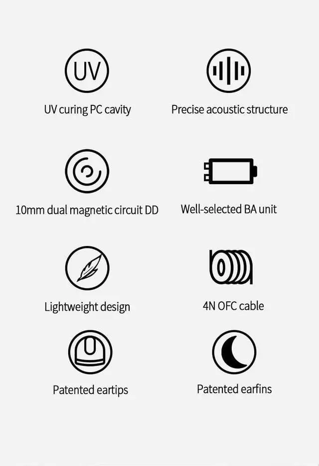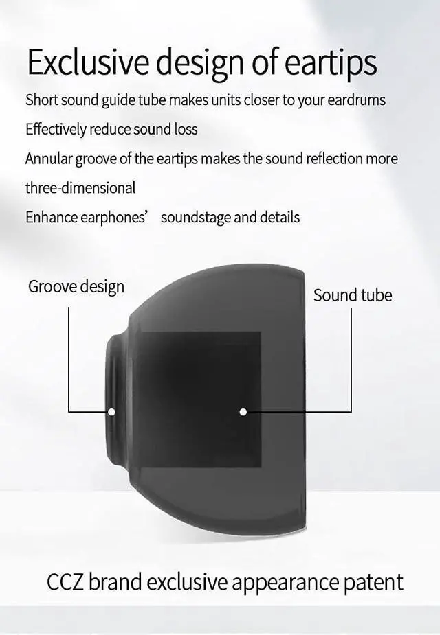 Exclusive design of eartips and earfinsThe eartips of CCZ Melody in ear monitors adopt TPE material and soft and environment-friendly TPE fin is added to the rear of cavity, providing a more comfortable, stable and lighter experience. ^^ UV curing PC cavity, Lightweight bodyWith high density PC transparent material, the internal structure of ccz melody wired earbud is fully visible. The cavity is covered with German nice-fit UV varnish, which is strong, comfortable, elegant, aesthetic and technical. A single headset weighs only 2.3 g, light and comfort to wear, releasing the burden of ears.