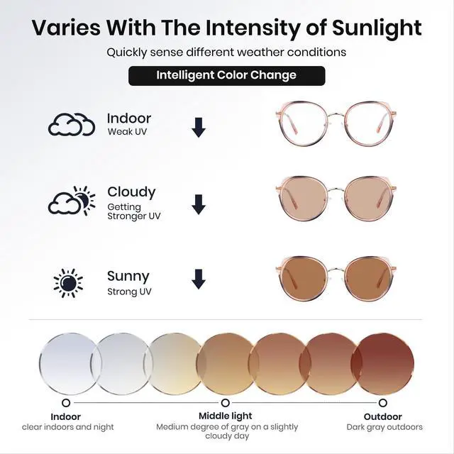 Any Light: Smart lenses automatically adjust to changing light conditions, ensuring clear vision indoors and outdoors while reducing eye strain ^^ Blue Light Blocking for