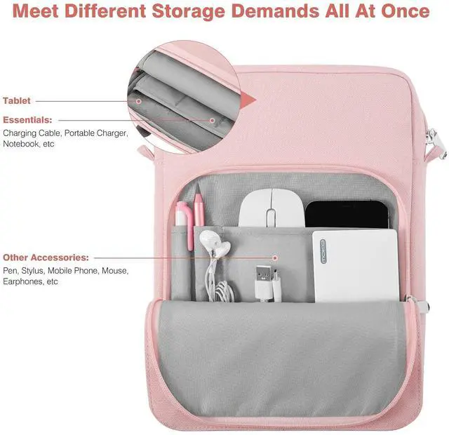 ^^ Convenient Storage: In addition to the tablet, the main compartment can also store charging cables, chargers, power banks, notebooks, etc. The outer zipper pocket can keep the smaller items well-organized, such as pens, mobile phones, mice, earphones. The zipper glides smoothly and allows easy access to your device.