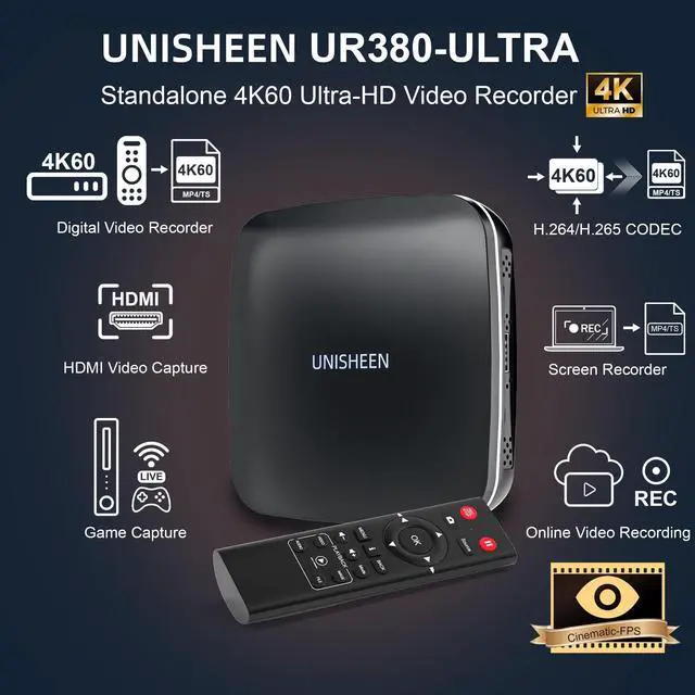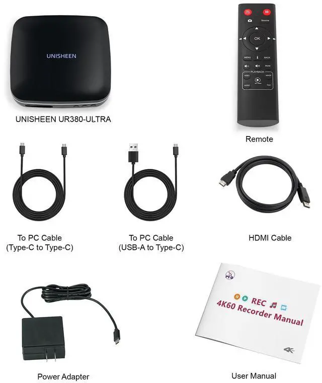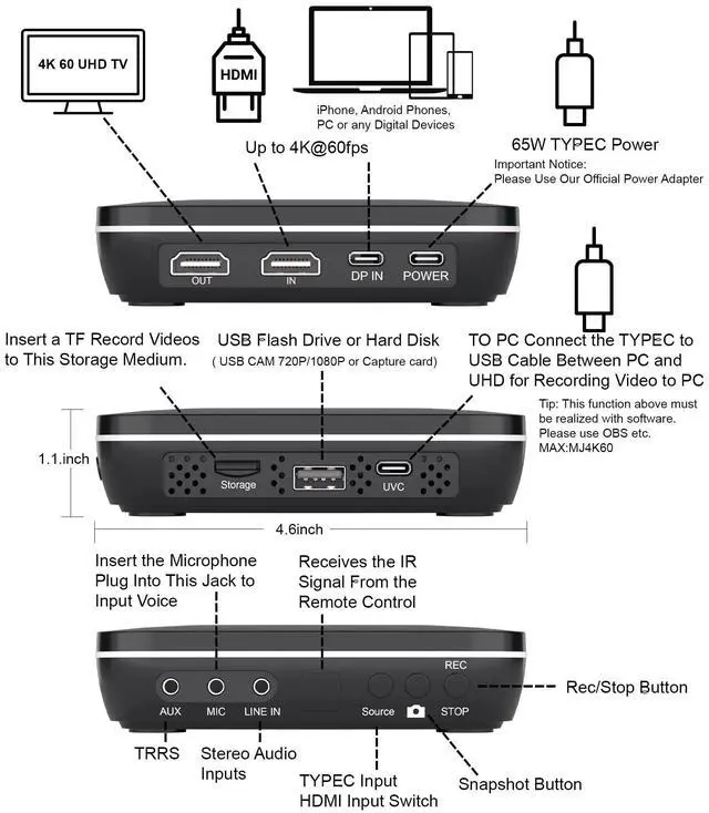 4K60 ResolutionSupports up to 4K60 for input and recording, delivering clear and smooth video. Ideal for professional production, HD live streaming, teaching, and event recording. ^^ Multiple InputsEquipped with HDMI, smartphone connection, DisplayPort (DP), and USB interfaces to meet diverse video source connection needs. ^^ Standalone & Computer ModesOperates independently as a standalone recorder or connects to a computer via USB for enhanced functionality like live streaming and editing. ^^ Multi-Functional Recording BoxOffers playback, audio-only recording, screenshot, remote control, custom file naming, and pause recording.