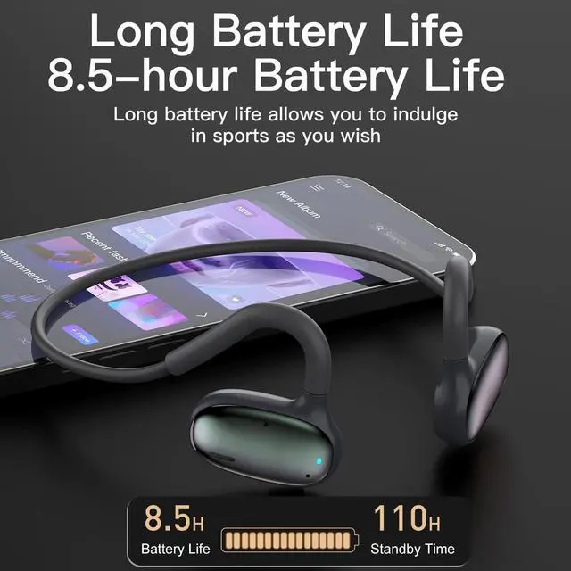 (no swimming) ^^ Lightweight & Ultra Comfort -- Unique ergonomic groove design on the open ear headphones cavity, ultra lightweight of only 160g/ 0.35 lb. Fit your ears firmly and securely, taking into account both comfort and safety, providing a breathable, open wearing experience to meet the needs to wear in sport activitives. In addition, it can pick up your voice exactly and block the noise from the surroundings in calling mode, significantly improves communication efficiency. ^^ Large Battery Capacity & Multi-function Buttons -- The air conduction earphone has a large battery capacity with standby time up to 110 hours and Magnetic fast charging about 1.5 hours, you can enjoy 8.5 hours of uninterrupted music/call.