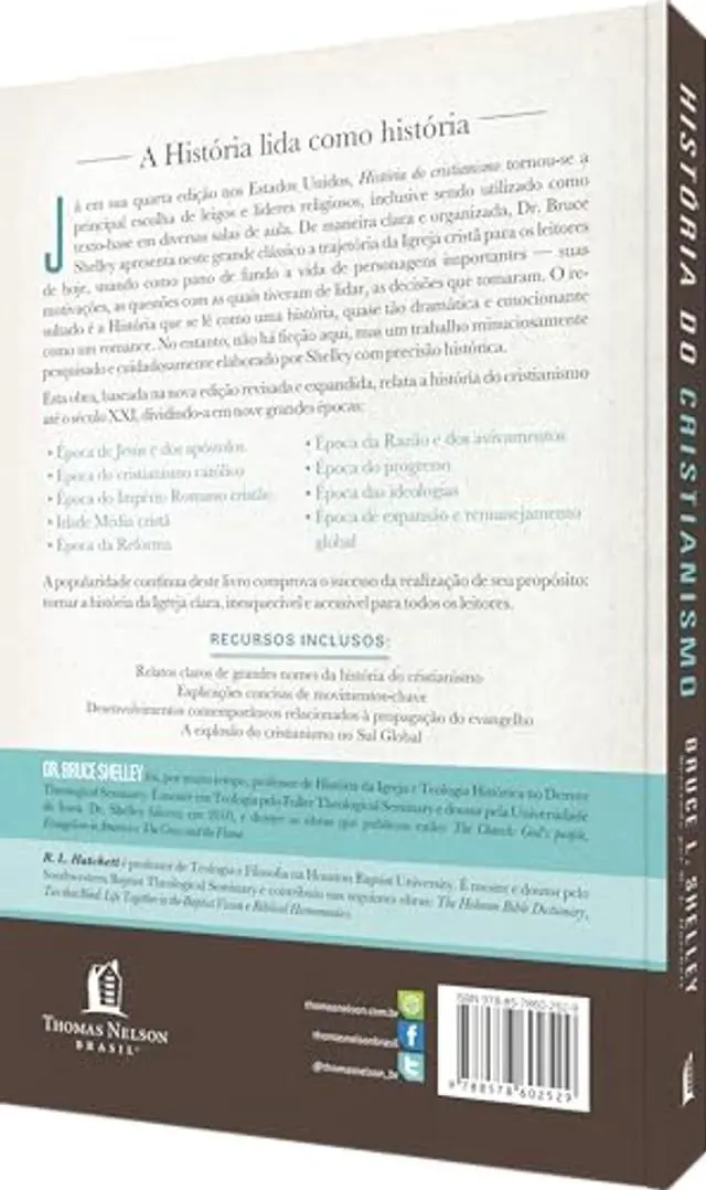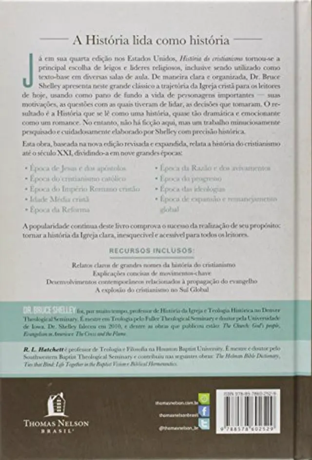 em nove grandes epocas: Epoca de Jesus e dos apostolos Epoca do cristianismo catolico Epoca do Imperio Romano cristao Idade Media crista Epoca da Reforma Epoca da Razao e dos avivamentos Epoca do progresso Epoca das ideologias Epoca de expansao e remanejamento Global A popularidade continua deste livro comprova o sucesso da realizacao de seu proposito: tornar a historia da igreja clara, inesquecivel e acessivel para todos os leitores.