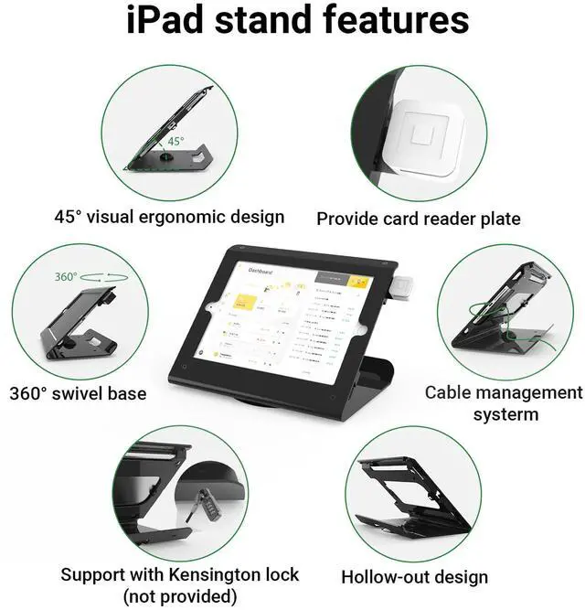 ROTATION BASE: Commercial iPad tablet stand with 360 swivel base, displaying conveniently between cashier and customer.