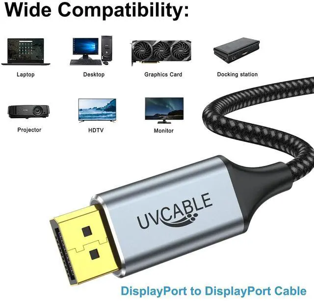 Incredible PerformanceSupports High-quality 3D, 4K @ 60Hz (3840x2160, Ultra HD), 1440p @ 144Hz (2560x1440, QHD), 3440x1440@100Hz, 1080P @ 144Hz (1920x1080, Full HD) ^^ AttributeDisplayPort cable (Displayport 1.0 / 1.1 / 1.2 / 1.3, DP, DP++). Compatible with computer equipped to HD monitor/display, projector or gaming graphics card with DisplayPort input ^^ Multi-functionCompatible with all DisplayPort (DP port ) devices and DisplayPort MST Hub. We have tested on 1080TI GPU, GTX 1070, Nvidia 980ti, Nvidia 2080Ti and Dell S2417,, Acer Predator X34, ASUS MG279Q, LG 34GK950F-B, ViewSonic VX4380 etc ^^ Actile and ToughEmbraced by sturdy cotton braided jacket feel smooth and soft to the touch and tactile.
