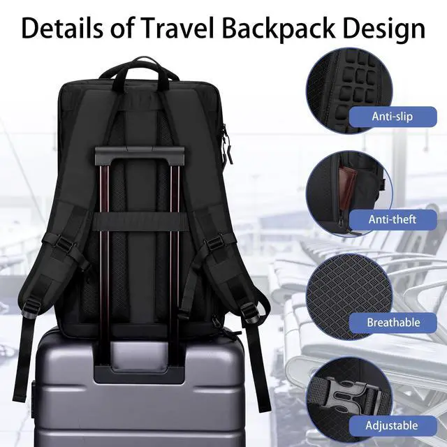 ERGONOMIC DESIGN AND VENTILATION: Travel backpack features a thickly padded, breathable mesh back panel for exceptional comfort. Top and side handles provide versatile carrying options. An adjustable chest strap helps transfer weight from your shoulders. A luggage strap on the back makes it easy to carry. The backpack is durable and can protect your items well. It's made of high density waterproof fabric, scratch resistant and waterproof ^^