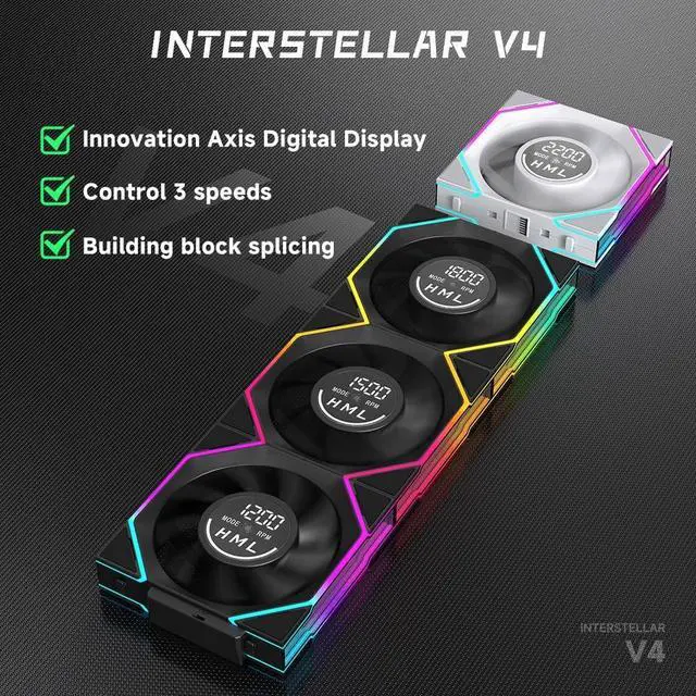 High: 600 - 210010% RPM ). The power cord lever enables convenient switching, suitable for multiple scenarios like cooling and quiet operation ^^ [Building - block Splicing]Adopts building - block splicing design, which can be quickly connected with a press, simplifying the installation process and easily creating a personalized chassis air duct ^^ [Infinite Mirror Colorful Lighting Effect]Transparent and widened infinity mirrors with high-brightness light beads provide translucent and brilliant RGB lighting effects, creating a cool chassis ^^ [Efficient Cooling with Low Noise]Air volume reaches 61.54CFM, 28MM thickness enhances air pressure (Positive pressure 3.18 mmHO, Negative pressure 2.89 mmHO ), ensuring cooling efficiency. The operating noise is only 29dBA, balancing quietness and cooling ^^ [Fan Specifications]Interstellar V4 120 case fan measures 120*120*28mm, comes with screws*12 and fan power cable*2, with hidden screw holes plus reusable rubber feet