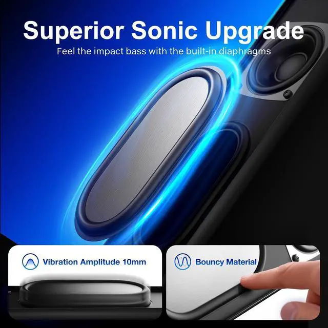 Immersive Sound for Everyday PlayEnjoy rich, room-filling sound designed for everyday use. With dual full-range speaker units, these computer speakers for desktop PC deliver clear highs and balanced mids that bring your content to life. ^^ Richer Sound with More DepthDesigned with dual passive radiators to add depth and dimension. Whether you're gaming, watching movies, or enjoying music, these PC speakers create a richer and more natural listening experience. ^^ Light Up Your SetupPersonalize your setup with 9 dynamic lighting modes, including Rainbow, Breathing, and 7 solid colors.