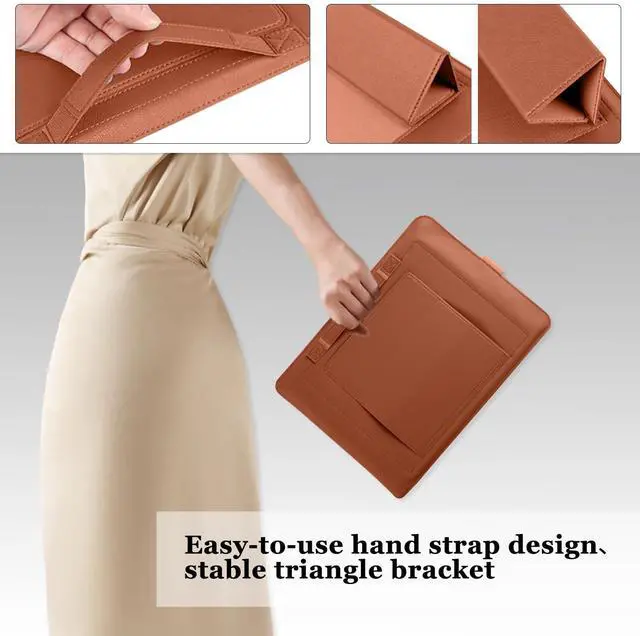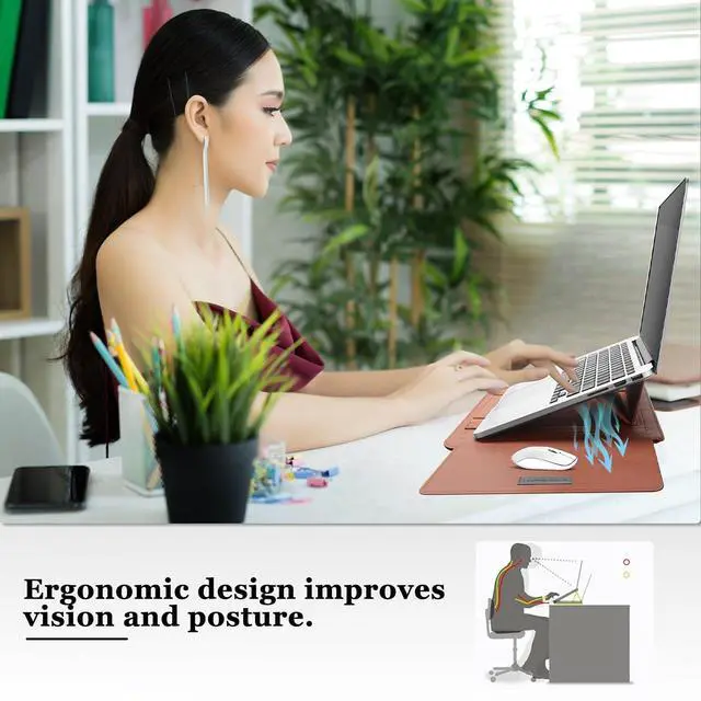 ^^ Innovative 3 in 1 FuntionThis laptop sleeve combines a laptop stand, laptop protective, and mouse pad in one. The flap doubles as a mouse pad, and the stand features a foldable design. Compact, lightweight, and stylish, it's perfect for travel or office use. ^^ Adjustable StandThe foldable triangular stand accelerates heat dissipation and extends the life of your laptop. Placing your laptop on the stand allows you to adjust your viewing angle, reduce pressure on your cervical spine, and alleviate hand fatigue from typing, allowing you to use your laptop in the most comfortable position.