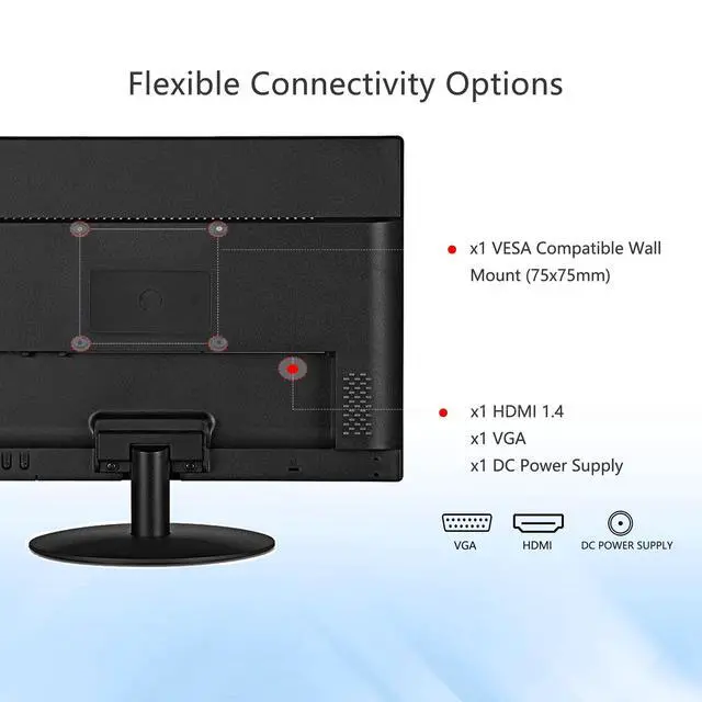 INCLUDED IN THE BOX: 17 INCH LED Monitor, DC Power Cable, HDMI Cable, Manual ^^ VESA mounting compliant (75mm)