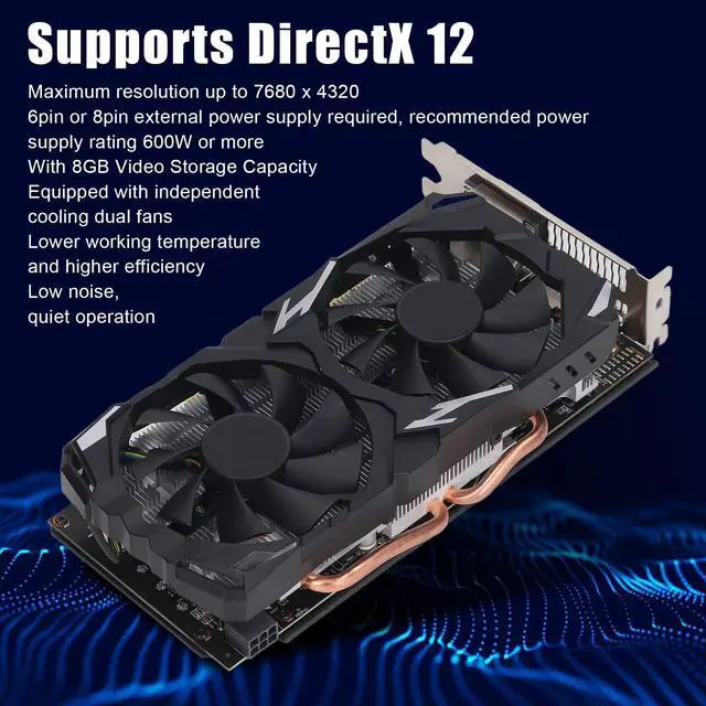 [High Performance] The core frequency of the graphics card is 1284MHz and the memory frequency is 7000MHz, which is smooth and stable, and can effectively meet your needs. ^^ [Efficient And Silent] Video Memory 8GB GDDR5 and equipped with independent cooling fans for lower working temperature, higher efficiency, low noise and quiet working. ^^ [Compact And Portable] High performance game graphics card with PCI Express 3.0 16X slot, small size, plug and play, easy to install, easy to carry and store. Suitable for playing games, PC work, watching movies and making videos.