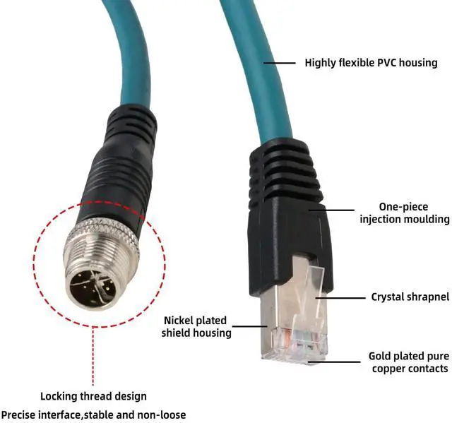 Reader: 262, DM260Q, DM262QL; Basler ace 2 pro/Basic GigE Vision; Basler blaze 111, 101, 102; Luxonis OAK-D Pro PoE; Teledyne DALSA BOA; Matrix Vision Lucid Triton GigE Vision Cameras, and other Industrial Machinery, automated inspection and measurement, network applications, supplying power to the vision system. ^^ X-CODED M12 ETHERNET CABLE Replacement Cable Cognex CCB-84901-2001-xx, Waterproof IP67-rated environmental sealing for dust & water protection; Connector Brass with nickel plated, thread locking mechanism, anti-vibration design, reliable Signal Transmission, black PUV jacket cable which is stable and durable.
