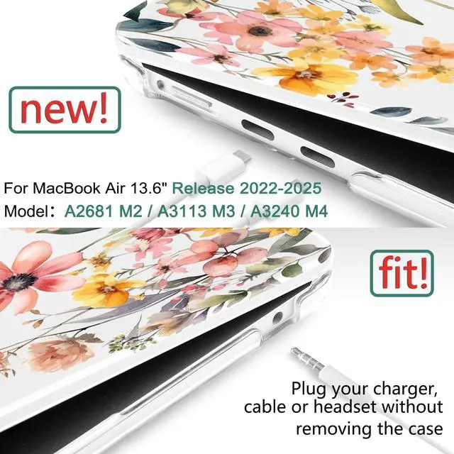 MacBook Air 13 inch (Model: A2337 M1 / A2179 / A1932) & 2017-2012 Older MacBook Air 13 inch (Model: A1466 A1369). Please kindly check the model number "Axxxx" on the back of the laptop before your purchase, make sure you choose the exact same model number as the listing title stated "A2681 or A3113 or A3240". ^^ CASE DIMENSIONS & WEIGHT - The case included top part and bottom part protects your laptop from scrapes and scratches. Top part is 13.38 x 8.85 x 0.3 inch. Bottom part is 13.38 x 8.85 x 0.48 inch. The whole case only weights 9.87 OZ. You'll feel your laptop more natural in hand. ^^ Easy Installation & Removal For Macbook Air 13.6 inch with M4 M3 M2 Chip & Touch ID Case - Our protective case has micro clips that securely fastens to your laptop, and snaps off with easy when needed. ^^ ABOUT KEYBOARD PROTECTOR & USB C to USB Adapter - Allows keyboard backlight to shine through. Completely washable and reusable. This USB C to USB adapter is compatible with M2 MacBook Air 13.6 inch 2022 2023. This is a USB-C female to USB-A male adapter designed for charging or data transfer and it will NOT support video signal transmission.
