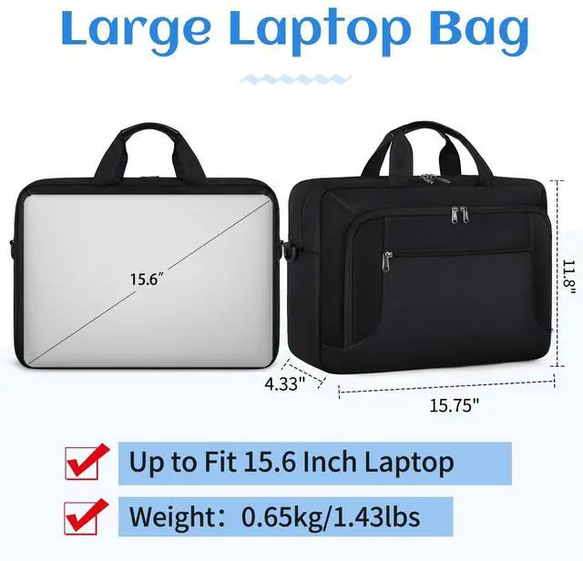 of large laptop bag: 15.75"L x 11.8"W x 4.33"H, weight: 1.43 lbs. 3 main compartments to meet all your needs well. The main tech compartment can fit 15.6 inch laptop (up to 15.6 inch) and 12.9 inch iPad. 1 Front large easy access pocket with 4 slots for magazines, textbooks, paper, kindle, wireless mouse, pens, passport, wallet, etc. 1 Front small pocket keep your small items like keys, change purse, tissue, etc. ^^ Durable &
