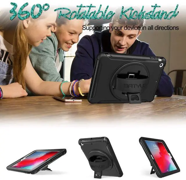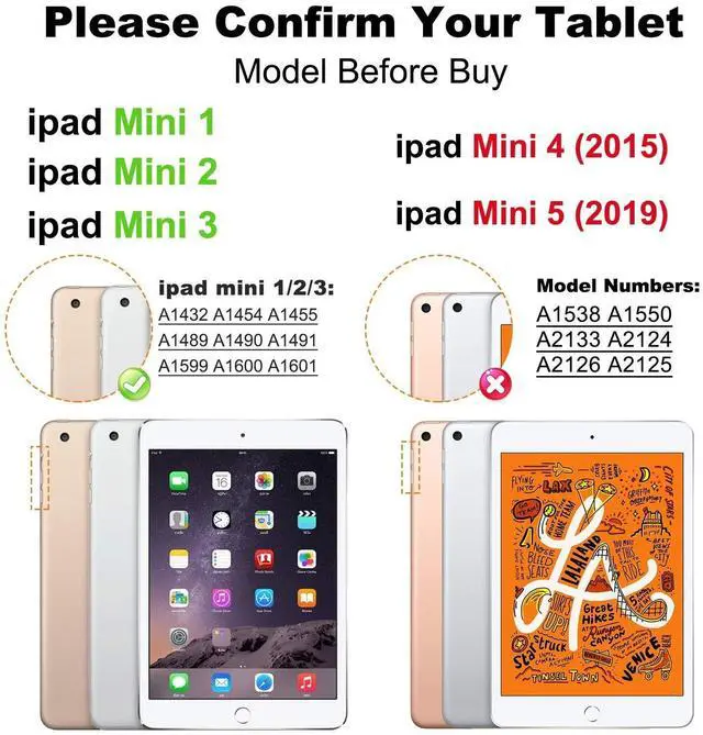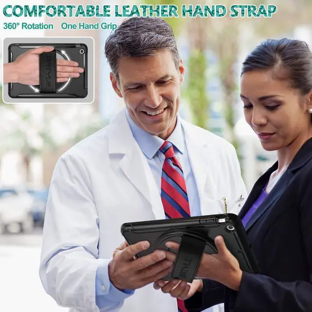 CompatibilityThis iPad mini shockproof case designed for iPad Mini 1(A1432, A1454, A1455), iPad Mini 2(A1489, A1490, A1491), iPad Mini 3(A1599, A1600, A1601), NOT compatible with iPad Mini 4(A1538, A1550) and other tablet models. Full access to all ports, functions and buttons with protection from dust and scratches. ^^ Easy To Use360 degree rotation mechanism built-in the centre of the back, makes kickstand more stable both in landscape and portrait mode, convenient for watching videos, conferences, presentations, etc. iPad mini case with hand strap perfect for students, teachers, doctors and those who need an iPad in a work environment.