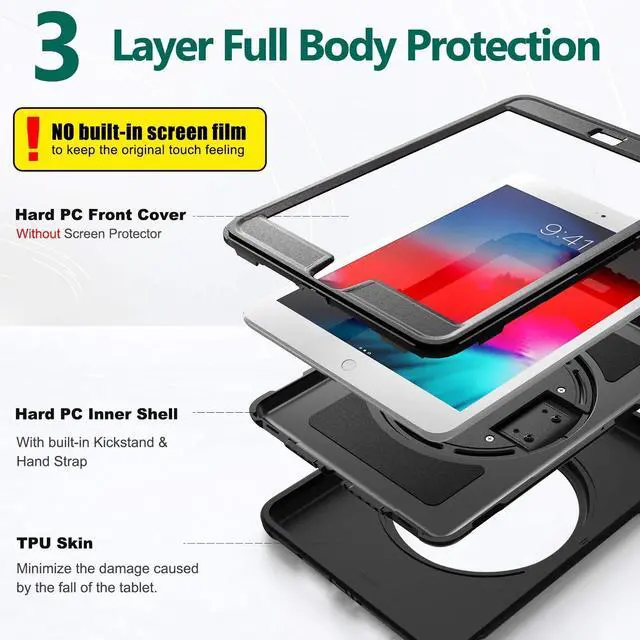Mini CaseHybrid three layer construction: consists a TPU outer frame and 2 pieces Hard PC Inner Shell, provides a full-body rugged protection for any type of accidental drops, scratches and shocks. Extremely ideal for kids, children, including girls and boys. ^^ NO Built-in Screen Protector & NO Front CoverTo remain original touch feeling of the tablet, this case doesn't have a built-in screen protector and front cover, only a Rugged PC & TPU Hybrid Case for iPad Mini 1, Mini 2, Mini 3, but it still can be used with screen protector. [WITHOUT Screen Protector!!! ] ^^ 100% Satisfaction GuaranteeIf you have any questions about the product or are not satisfied with it, please contact us at any time, we will provide you with a best solution. Your satisfaction is our main concern.