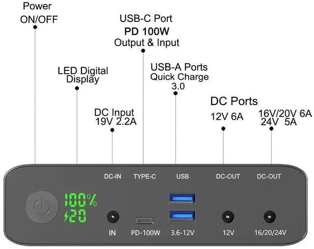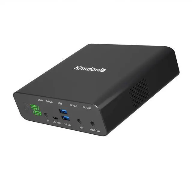 For All Your USB-C DevicesFrom high powered USB-C laptops to tablets and smartphones, Krisdonia can keep all your devices charged up. 100W USB-C powers most USB-C devices including MacBook Pro, Surface Book 2 and Wacom Mobile Studio Pro. ^^ Adjustable DC OutputBuilt in 2 DC output. One port supports 12V 6A; another supports 16V/20V 6A, 24V 5A. The battery bank can directly charge your laptop without needing your laptop charger. ^^ Extensive FeaturesAll-In-One power solution with high powered USB-C PD, adjustable DC for laptops, QC 3.0 USB-A, pass-through charging and fast recharging.