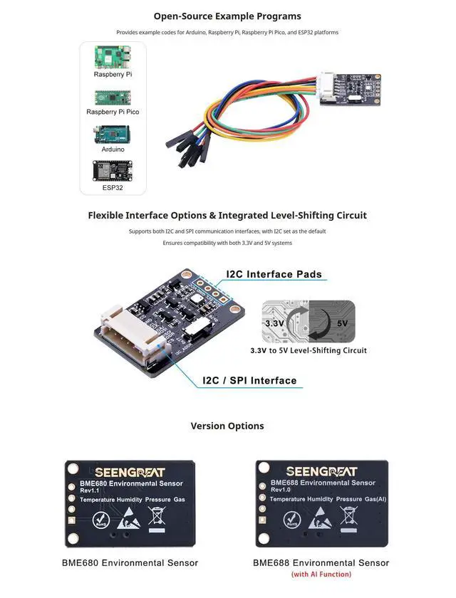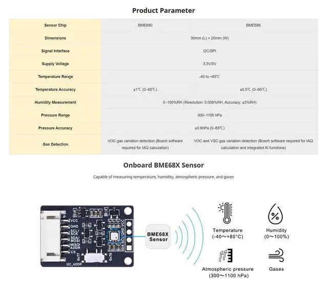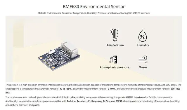 OverviewThe BME688 Environmental Sensor is an advanced, versatile solution for environmental monitoring, featuring an onboard BME68X sensor capable ofdetecting temperature, humidity, barometric pressure, and gas levels. Designed for ease of use, this sensor module supports both I2C and SPIcommunication, with configurable I2C addresses and cascading support for multi-device applications. Thanks to its built-in voltage translator, the BME688 is fully compatible with 3.3V and 5V systems, allowing seamless integration into projects using forRaspberry Pi, Raspberry Pi Pico, Arduino, or ESP32. Whether you're working on IoT, AI-enhanced sensing, or environmental data collection, this moduleoffers unparalleled versatility.