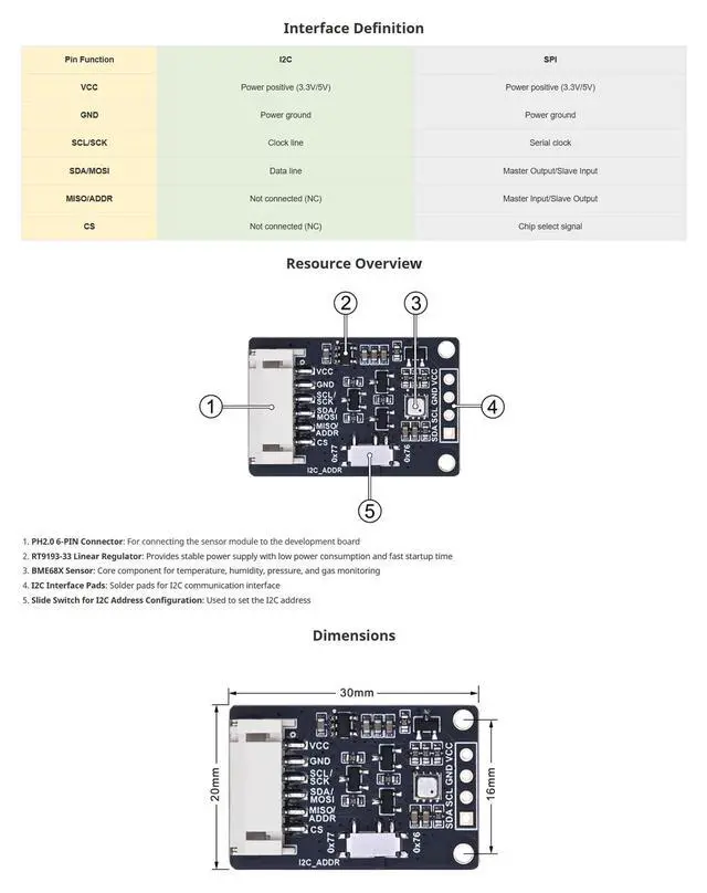 The package includes access to detailed online development resources and examples, ensuring that both beginners and advanced users can unlock thefull potential of the BME688 Environmental Sensor. Whether you're monitoring indoor air quality, building a weather station, or creating an IoT-enabledsystem, the BME688 Environmental Sensor is your ideal choice for reliable and precise measurements. Package include1. BME688 Environmental Sensor x12. PH 2.0 6PIN cable (~20cm) x1