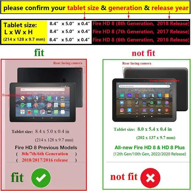 Compatible Model: for Fire HD 8 Tablet (8th Generation, 2018 Release) 8.0 -Inch Tablet; for Fire HD 8 Tablet (7th Generation, 2017 Release) 8.0 -Inch Tablet; for Fire HD 8 Tablet (6th Generation, 2016 Release) 8.0 -Inch Tablet; UUcovers