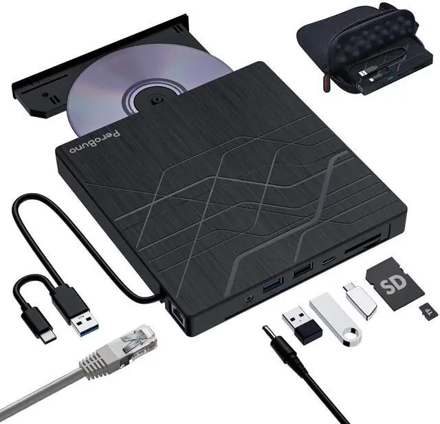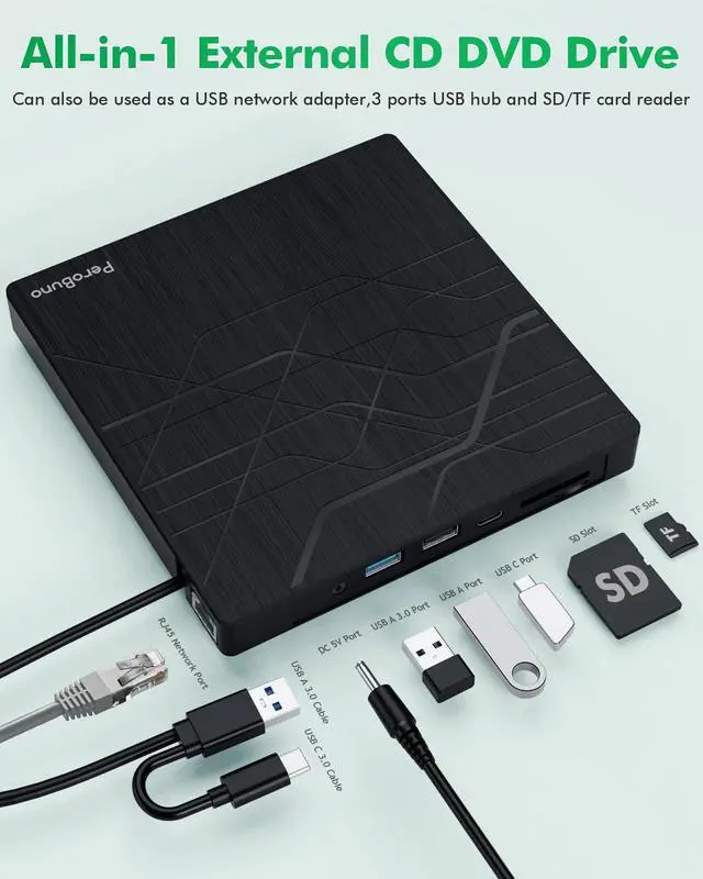 Powerful External CD/DVD Drive for Mac PCConsidering that most of the latest laptops and desktop computers are not equipped with the internal CD/DVD drive, network interface, SD/TF card slot, and the number of USB interfaces is generally insufficient. This latest PeroBuno full-featured USB 3.0 external DVD drive is the perfect solution for most computers. Just plug the data cable (on the back of the external CD drive) into your computer's USB-A or USB-C port, then you can start using all the above features. Your computer will automatically recognize it and come with drivers, no complicated settings required, Plug and Play! ^^ Full-Featured External CD/DVD Drive for Macbook LaptopThis is not only an external CD DVD player/ reader/ writer/ rewriter/ burner/ recorder/ ripper, but also a USB A/C 3.0 computer network adapter, 2*USB A and 1*USB C USB 3.0 hub, SD/TF card reader.