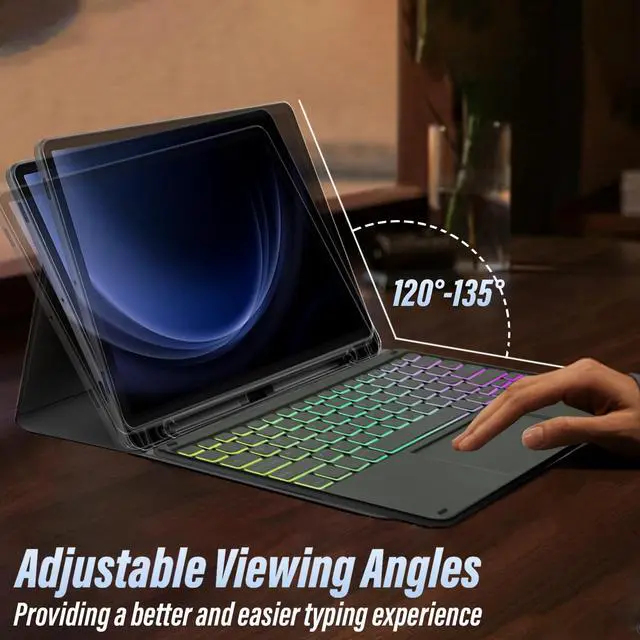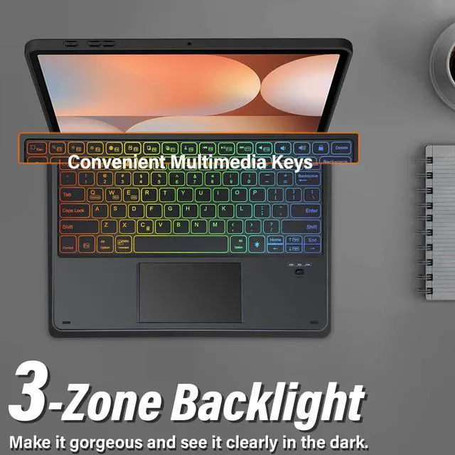 ^^ Built-in Multi-Touch TrackpadOur integrated multi-touch trackpad perfectly adapts to Android system, with plentiful trackpad gestures, delivering a comfortable user experience while allowing you to click, scroll, and swipe through content effortlessly. ^^ Multiple Angles& RemovableInnovative magnetically detachable wireless keyboard design allows you take it off from your tablet case, to easily adjust the angle of the tablet to your preference. Removable wireless keyboard with case that transforms your tablet into a laptop or your favorite book in less than a second ^^ 3-Zone Rainbow BacklightRainbow backlight and breathing light mode switch.