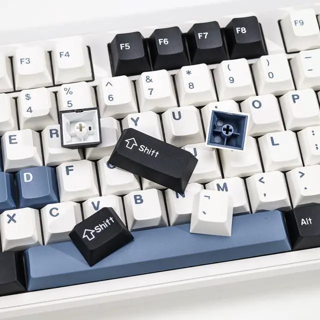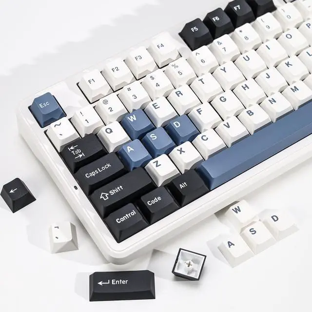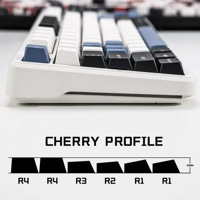 (Cherry Profile) Cherry Profile keycaps have a trapezoidal design with R1-R4 layout with different height and angle slope, which is ergonomic and makes typing easier ^^ (Accessories Included) This keyboard keycap set consists of 174 keycaps, including 128 base set keys and 46 supplementary set keys. We have three colours of keycaps: White Blue and Black so you can DIY your keys to your heart's content! keycaps do not include the keyboard. The keyboard in the picture is for display purposes only ^^ (PBT Double Shot Keycap) These keycaps are made of PBT Double Shot. Compared with ABS material, PBT is abrasion-resistant, heat-resistant, dirt-resistant, non-colour-flaking, and can be cleaned with water, providing you with a better and comfortable experience ^^ (Widely Compatibility) It can be used for ANSI/ISO layout mechanical keyboard. And its compatible for 60%/65%/75%/80%/100% (61/64/68/82/84/87/100/104/108) keyboards. The keycaps are compatible with any key switches with cross-shaped switches ^^ (Customer Support) Customer satisfaction has always been KBDiy top priority. If you have any questions about our products, please contact us immediately and we will provide you with a satisfactory solution within 24 hours