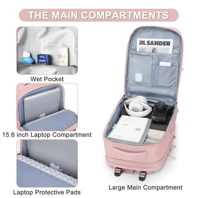 Extra Large Expandable DesignThe everyday clothing pockets can hold 6-8 lightweight tops or pants. This travel bag also features an expandable capacity space for placing more clothes, along with clothing straps, catering to the needs of a family's short trips. The separate laptop compartment can accommodate a maximum 15.6" laptop, meeting your work or daily leisure requirements. ^^ Separate Shoes Compartment and Wet PocketThe shoes compartment can hold a pair of slippers or low-top sneakers, allowing you to switch freely in different states of travel, business trips and outdoor sports; the wet pocket is made of high-density waterproof material, which can be used with to store wet items, making your stay in a hotel or apartment more convenient.