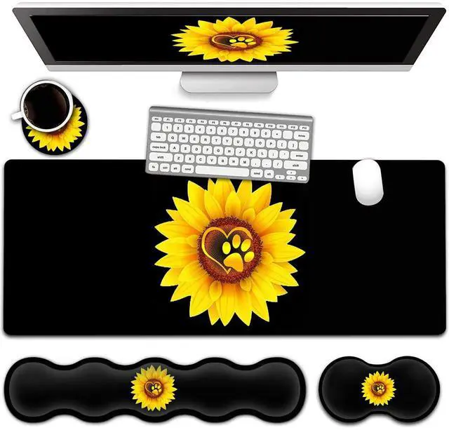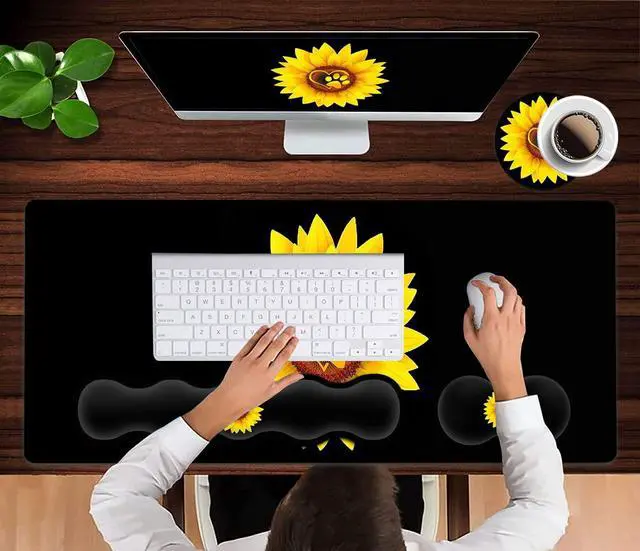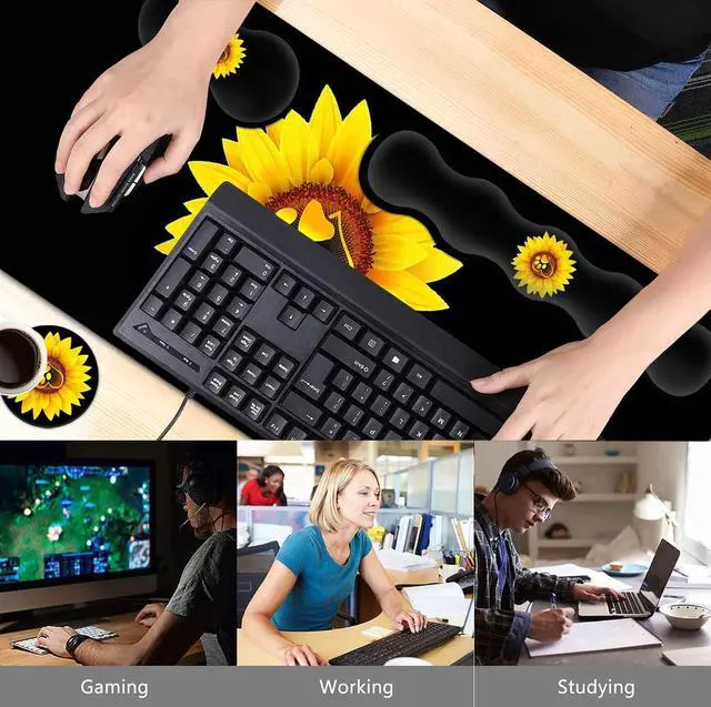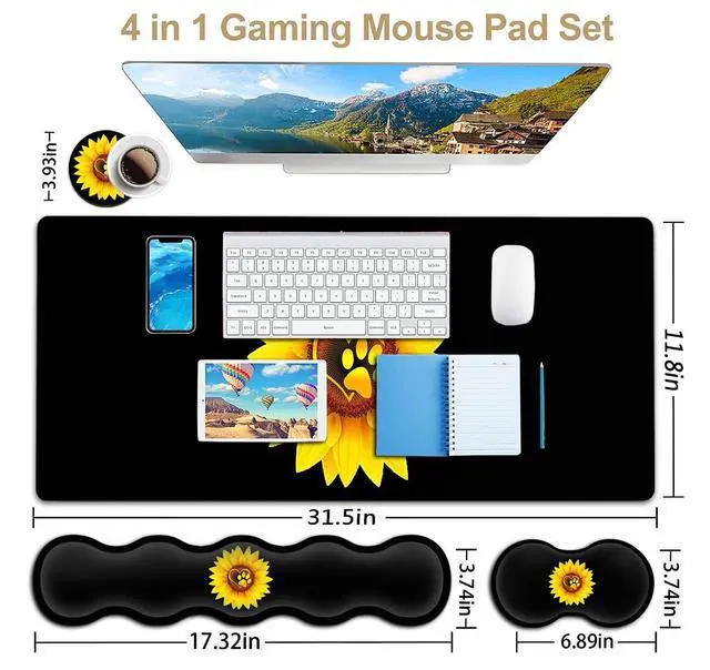 Super Good Deal SetErgonomic mouse pad includes desk pad ( 31.5 x 11.8 inch), keyboard wrist rest( 17.3 x 3.74 inch), mouse wrist rest( 3.74 x 6.9 inch), cup coaster( 3.9 x 3.9 inch). No need to buy separately. This desk pad for keyboard and mouse, is large enough to fit your mouse, gaming keyboard, and other desk items. Keep a clean, uncluttered desk. This helps to improve the gaming experience or work efficiency in the office. ^^ Ergonomic Keyboard Wrist Rest - Ergonomic design of these two wrist rests fits perfectly on the wrist.
