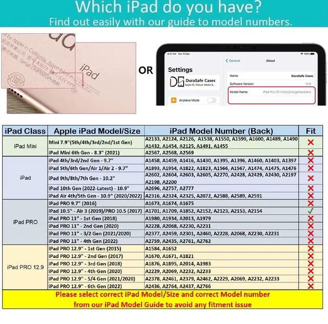 Key FeaturesExclusively designed for iPad PRO 10.5 2017 / Air 3rd Gen 10.5 2019Smart Auto Sleep/Wake Full Protection & Precise Cutouts for Ports/CameraMulti-Angle Viewing/Typing StandEasy to InstallCompatibilityAll iPad PRO 10.5 2017 / Air 3rd Gen 10.5 2019 ModelsAir 3rd Gen 10.5 2019WiFi (A2152 MUUL2LL/A, MUUK2LL/A, MUUJ2LL/A, MUUT2LL/A, MUUR2LL/A, MUUQ2LL/A)WiFi+Cellular (A2123, A2153, A2154 MV172LL/A, MV162LL/A, MV152LL/A, MV1G2LL/A, MV1F2LL/A, MV1D2LL/A)iPad PRO 10.5 2017WiFi Only (A1701 MQDX2LL/A, MQDT2LL/A, MQDW2LL/A, MQDY2LL/A, MPF22LL/A, MPDY2LL/A, MPF02LL/A, MPF12LL/A, MPGL2LL/A, MPGK2LL/A, MPGH2LL/A, MPGJ2LL/A)WiFi + Cellular (A1709, A1852 MPME2LL/A, MPHK2LL/A, MPHH2LL/A, MQF12LL/A, MPMH2LL/A, MPMF2LL/A, MPHJ2LL/A, MQEY2LL/A, MPMG2LL/A, MPHG2LL/A, MQF22LL/A, MQF02LL/A)DuraSafe Cases - Durability & Safety of your device in Style.