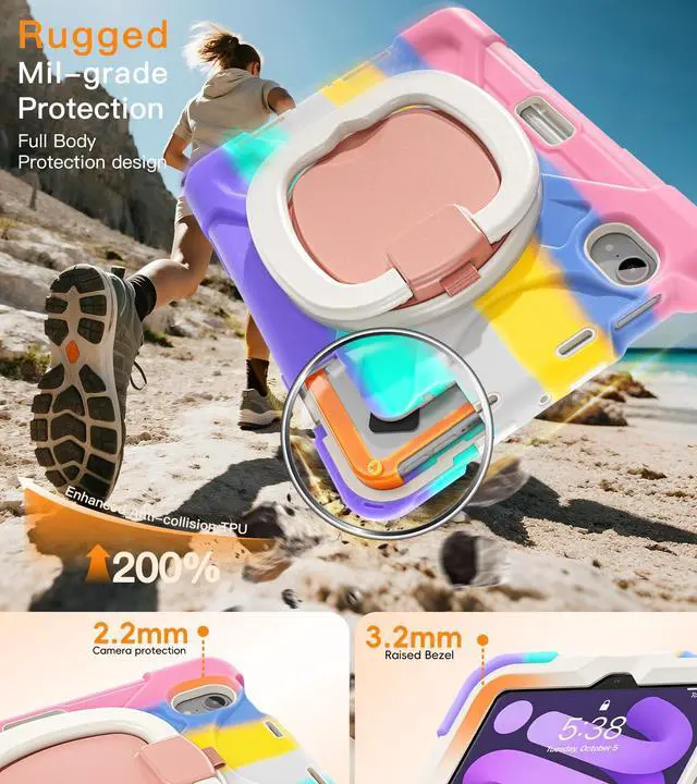 Mini 6 2021 (Model: A2567/A2568/A2569). Please check the model number on the back before purchase. ^^ [Built-in Triple-Layer Protection] Advanced 3-in-1 structure, crafted from high-quality PC and shock-absorbing silicone materials, provides comprehensive protection for your tablet, effectively guards against accidental drops, vibrations, slips, and scratches. Don't worry about your iPad slipping from your child's hands and breaking. No need to remove the shell to fully access all ports, buttons and cameras. (Does not include screen protector) ^^ [Amazing Multi-function Handle-Kickstand] The 360 Degree Rotating Kickstand provides multi-angle viewing, offering a pretty convenient user experience for film watching, working and typing. The stand remains highly stable on various surfaces. It can also be opened as a comfortable handle for secure gripping and carrying. ^^ [Removable & Adjustable Carrying Strap] Portable Shoulder Strap offers convenient, hands-free portability for your iPad at work, on trips or outdoors. You can also hang it behind a car headrest or wherever you want. ^^ [Safe Storage of Apple Pencil] This iPad Mini protective case provides a built-in pencil holder that hugs your iPad closely. Simply insert your Apple Pencil into the holder for secure storage and simultaneous charging.