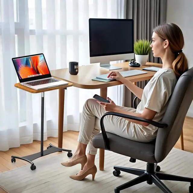 Rolling Laptop Stand: With a sturdy base, lockable wheels, and smooth mobility, this stand ensures stability on various surfaces. It can be used as a floor-standing model or placed on a desk separately, making it perfect for office, study, entertainment, and projector use ^^