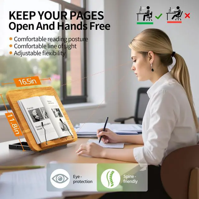 Clip Design: The 0.5 -inch thick wooden panel ( 16.5" x 11.8" ) offers more space than most standing laptop stands, supporting a variety of devices. Raised 2-inch edges prevent slipping for added stability. The built-in book clip secures books or documents, keeping your hands free for improved comfort ^^ One