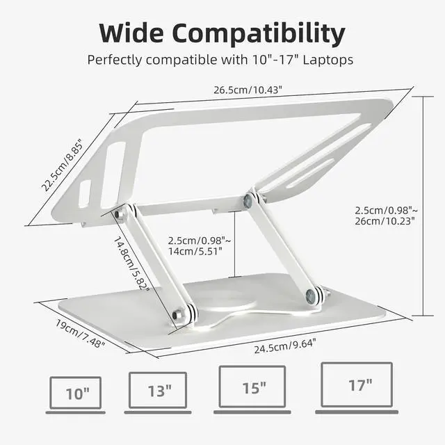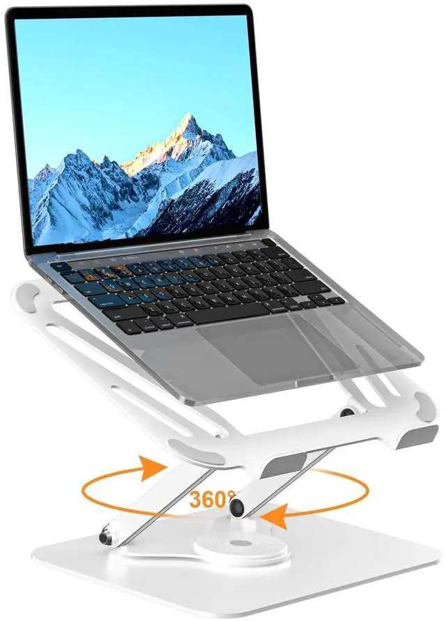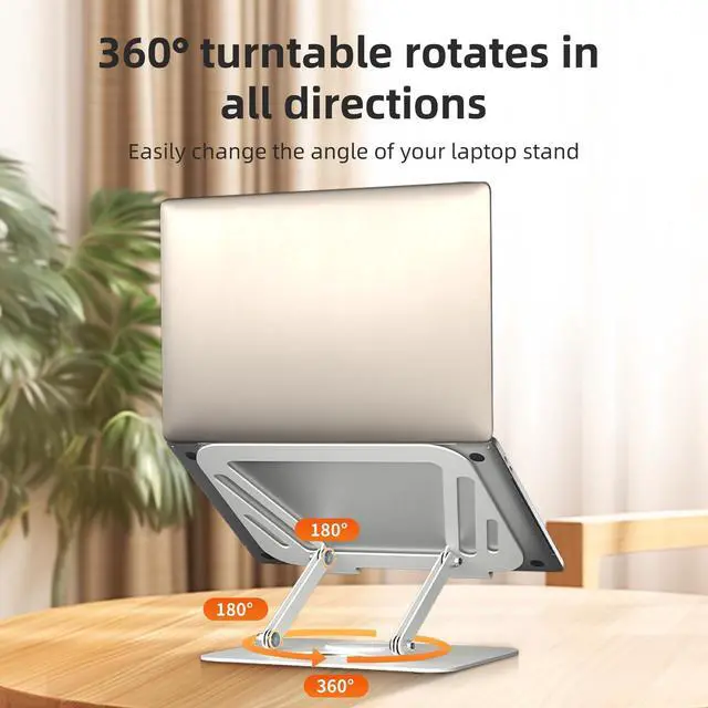^^ 360 Degree Rotation: This laptop desk stand can rotates on its centered round base, allowing the top half of the stand to rotate infinitely in either direction. This give you plenty of flexibility in terms of working position. It will be especially useful for group projects or meetings. ^^ Stable and Protective FunctionThe adjustable laptop stand is made of metal heat conduction alloy material, which is sturdy and durable. The padding on the laptop stand prevents your laptop from getting scratched and dropped.