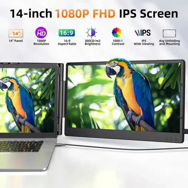 Premium Visual Experience: The 14" portable laptop monitor offers a 1920x1080P Full HD resolution IPS display with 80% color gamut and 300 nits brightness at 60Hz refresh rate. Enjoy a wide viewing angle and rich, vibrant colors. Bringing you a clearer and more accurate color reproduction picture. Reducing eye fatigue and enhance your visual experience like never before. Adjust brightness/volume via laptop extended monitor portable side buttons.