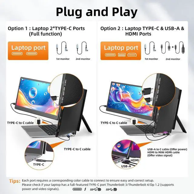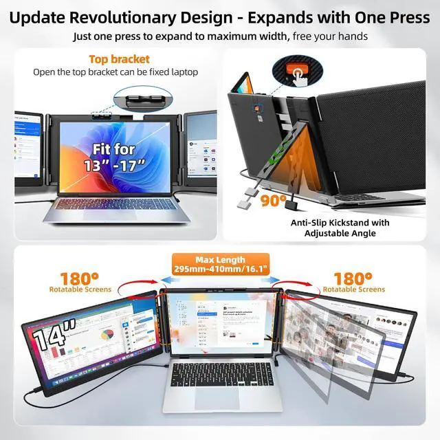 ^^ 180 Rotatable Stand: Rotate the expansion laptop monitor 0 to 180 or lay it flat for your meetings, presentations to share the same laptop screen content. This portable monitor for laptop feature ensures you can adjust the monitor extension for laptop angle for optimal viewing while watching movies or giving presentations. Includes a magnetic dual screen monitor for laptop extender protector and travel pouch (About 4.5 pounds). Stable base fits 13"- 16.5" laptops. ^^ Plug and