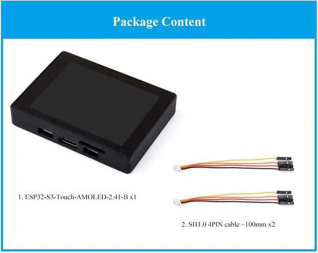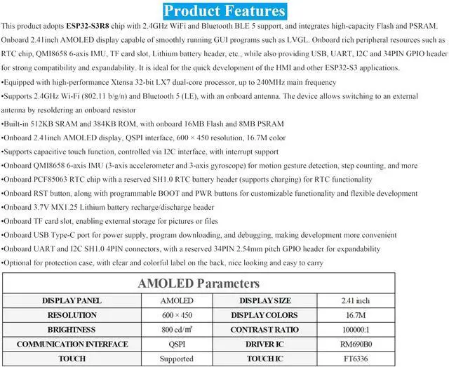 ESP32-S3 2.41 inch AMOLED Touch Display Development Board (This is with Case version). Equipped with high-performance Xtensa 32-bit LX7 dual-core processor, up to 240MHz main frequency. Supports 2.4GH z Wi-Fi ( 802.11 b/g/n) and Bluetooth 5 (LE), with an onboard antenna. The device allows switching to an external antenna by resoldering an onboard resistor. ^^ Built-in 512KB SRAM and 384KB ROM, with onboard 16MB Flash and 8MB PSRAM. Onboard 2.41 inch AMOLED display, QSPI interface, 600 x 450 resolution, 16.7M color. 178 wide viewing angle Supports capacitive touch function, controlled via I2C interface, with interrupt support.