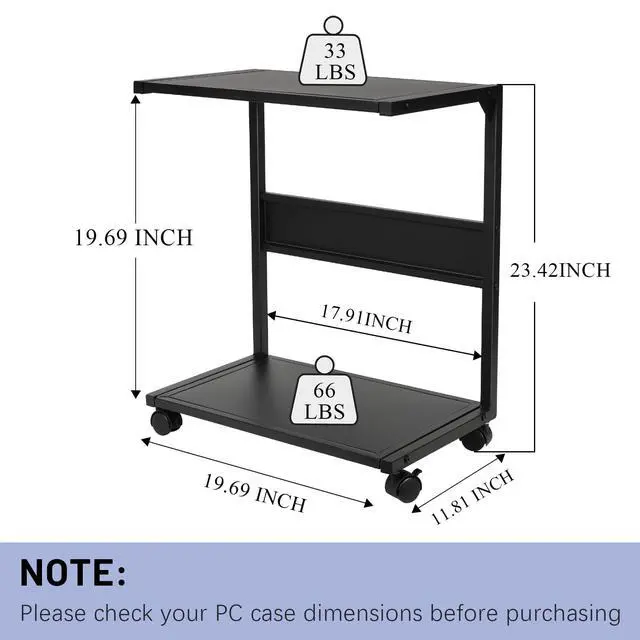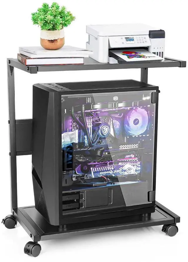 ^^ Storage & Movement: The 2-layer shelf meets most storage needs. PC cases are placed on the bottom layer, and printers, plants, books, etc. are stored on the upper layer. The four universal wheels with brakes are easy to move and can remain stationary when in use. ^^