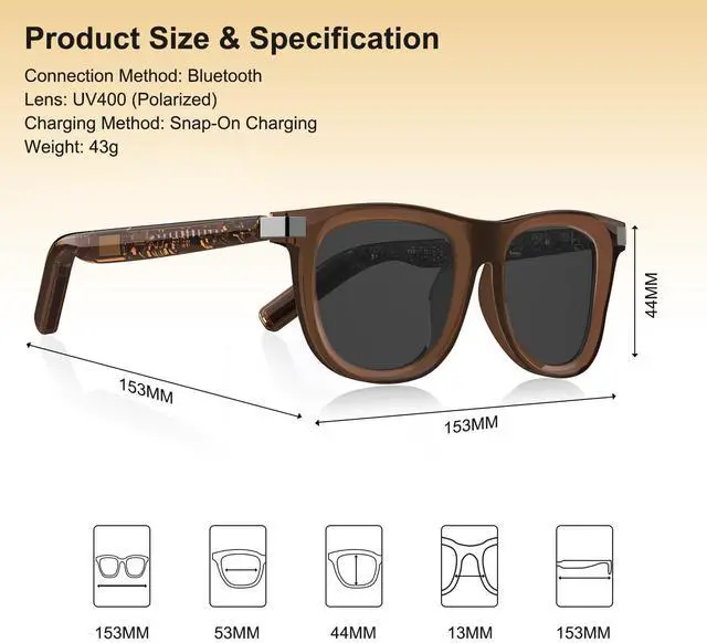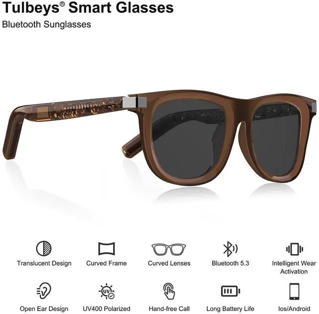 New Fashion Curved DesignTulbeys smart glasses for men women adopt a new translucent curved frame and curved lens design. Unique curved design makes you the focus of the crowd, Translucent temples show fashion and make you different. Smart bluetooth glasses for big head/large face. ^^ Wearing Sensor Power On/OffThe G06 Bluetooth glasses for men & women equipped with smart sensors to track the wearing status, activated immediately when worn, and shut down when taken off to save battery life and save your time. ^^ Outdoor Mode & Voice Assistant Audio Bluetooth sunglasses Equipped with outdoor mode, activating outdoor mode can greatly increase the volume with anti-leakage sound design improve your listening experience.