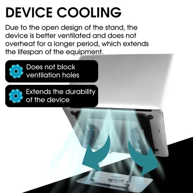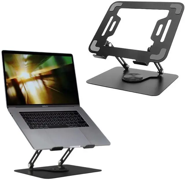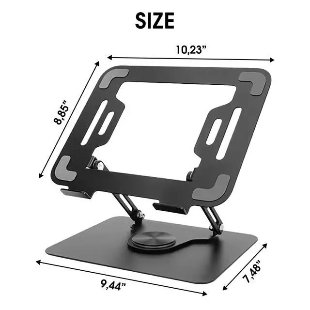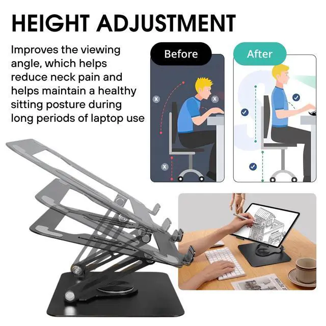 Upgrade Your Workspace Comfort & Productivity Experience next-level ergonomics with this adjustable laptop stand for desk engineered to improve posture, reduce neck and back strain, and maximize productivity during long hours of work. Whether youre working from home, in the office, or on the go, this portable laptop riser is the perfect companion. The 360 rotating base makes screen sharing effortless, while the sturdy aluminum alloy construction ensures your device stays stable and secure. It supports laptops from 10" to 16", including MacBook, Dell, HP, Lenovo, ASUS, and gaming laptops.