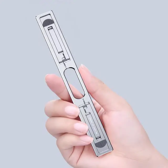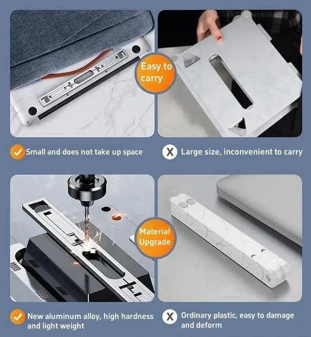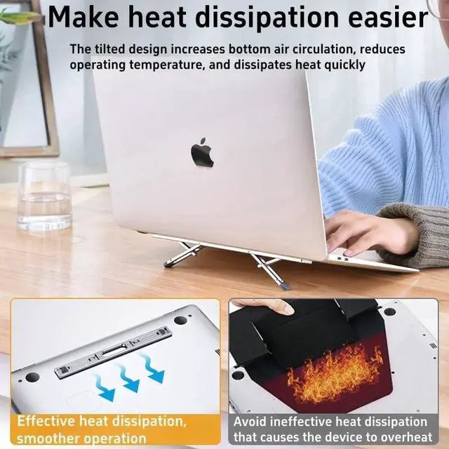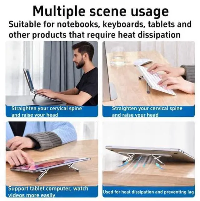 1. Experience ultimate portability with our folding invisible stand for laptop, designed to be compact and lightweight, making it the perfect portable laptop stand for office or travel. ^^ 2. Adjust your laptop to the perfect height with our laptop stand adjustable height feature, which offers four-level adjustments to promote ergonomic comfort and reduce cervical fatigue. ^^ 3. Our foldable laptop stand features durable pop up leg stands laptop technology, ensuring a stable and sturdy base for your device, enhancing heat dissipation performance. ^^ 4. The mini laptop stand boasts a frosted metal finish with a delicate texture, blending seamlessly with any desk aesthetic.