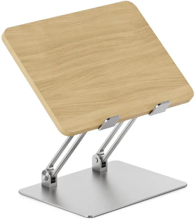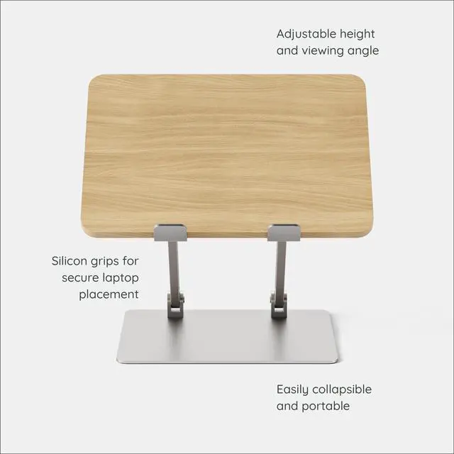 DESIGN: Built from anodized aluminum and an MDF top with secure silicon grips, this sturdy wood laptop stand keeps devices in place while resisting wobble and wear, ideal for daily use across a range of laptop sizes.