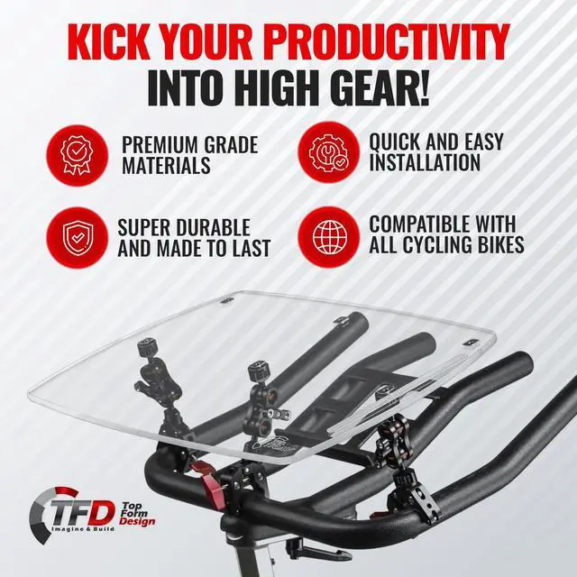 Kick your productivity into high gear! The TFD Universal Tray seamlessly turns your compatible Cycling Bike into a functional dual-purpose workstationwork, meet, read, stream, and watch TV while you ride. This supportive acrylic tray fits onto your handlebars and is the perfect laptop tray or holder for your tablet, phone, books, and other devices! ^^