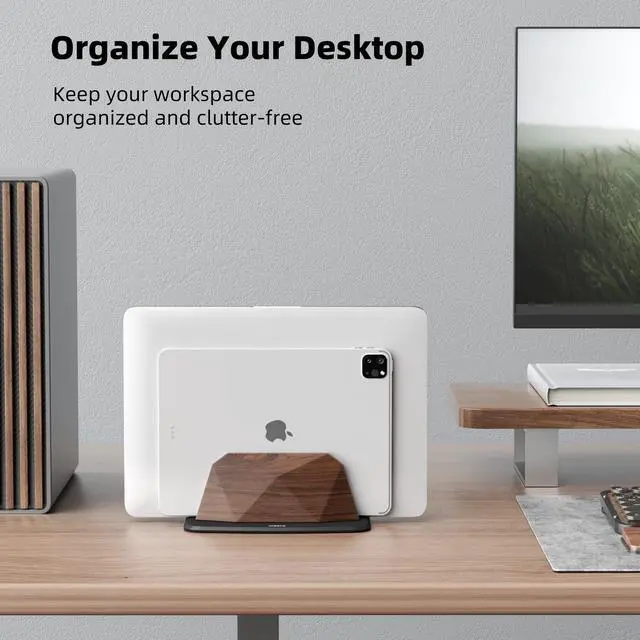 Dual-Slot Vertical Design: Featuring a dual-slot layout, this stand allows you to store two laptops upright at once, maximizing vertical space. It reduces desk clutter, creating a clean and organized workspace while improving efficiency and space utilization for both home and office setups. ^^ Geometric Elegance with