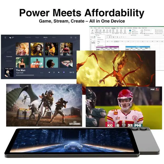 Fast Charging: The 9000mAh high-capacity battery ensures extended usage, delivering 6 hours of video playback, 10 hours of music streaming, and 15 hours of eBook reading. The 5V/3A Type-C fast charging minimizes downtime, keeping you powered throughout the day ^^ HD Cameras & Immersive Quad-Speaker Audio: Equipped with a 13MP main + 5MP auxiliary rear camera with autofocus, capturing stunning photos and videos even in low light. The 5MP front camera is ideal for video calls and selfies. Four high-fidelity dual-magnet BOX speakers provide an enhanced stereo sound experience, perfect for gaming, movies, and music ^^ Complete 2-in-1