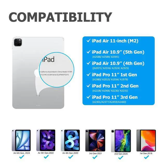 Wide Compatibility: Seamlessly compatible with all iPad Pro 11 inch 4th Gen (2022), 3rd Gen (2021), 2nd Gen (2020), and 1st Gen (2018). ( A2759/ A2435/ A2761/ A2762/ A2377/ A2459/ A2301/ A2460/ A2228/ A2068/ A2230/ A2231/ A1980/ A2013/ A1934/ A1979).