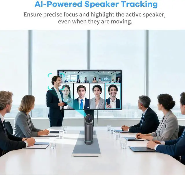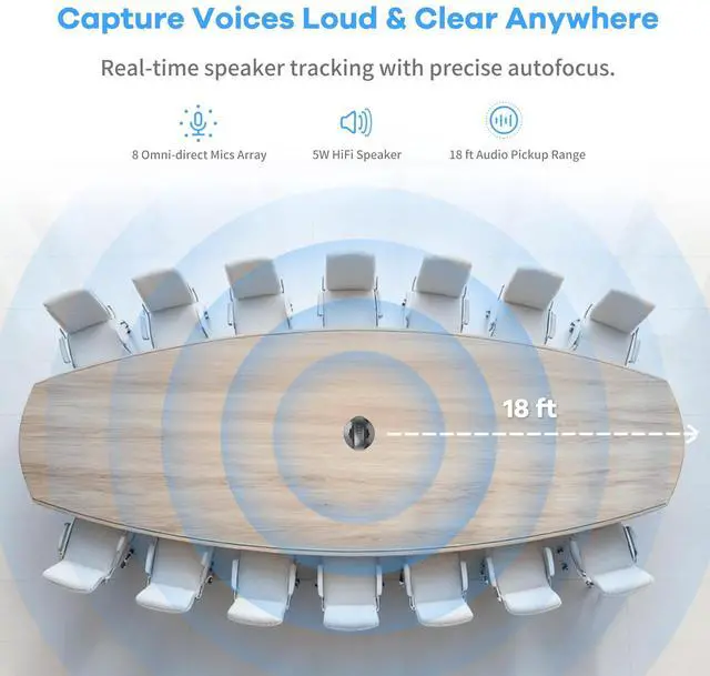 1.360 Coverage & AI TrackingDual 195 wide-angle lenses offer a complete 360 view, ensuring no one is left out. With AI face and voice tracking, this video conference camera automatically highlight the active speaker even when the speaker is moving. ^^ 2. 8-Mic Array & High-Fidelity AudioEquipped with eight omnidirectional microphones and a powerful, 5W, high-fidelity speaker, the 360 conference room camera offers an 18 ft audio pickup range while minimizing ambient noise to deliver crystal-clear, loud communication from any position in the room. ^^ 3. Portable, Compatible & Easy To UseThis all-in-one 360 webcam is lightweight ( 0.8 kg) and plug-and-playno extra devices needed.