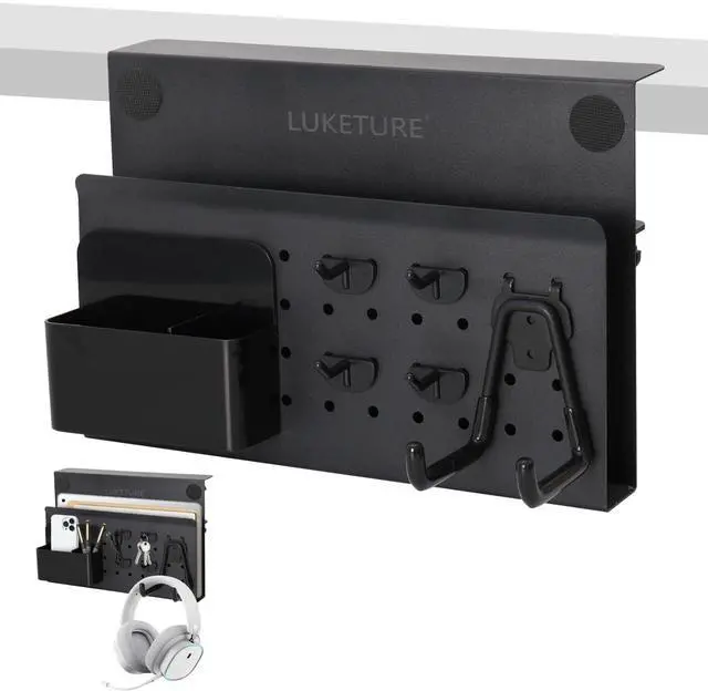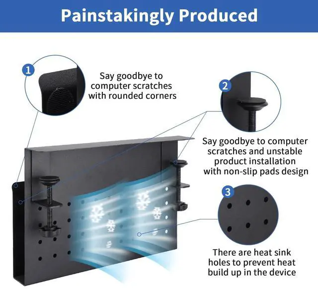Innovative Design Clamp On Desk Organizer & Personalize Your Workspace: Expand your workspace with innovative clip-on desk pegboard Laptop Holder without drilling holes in your desk. The heat dissipation holes are designed with holes, which can be used with hooks to hang items. With our desk dise organizer, you can hang the appropriate pegboard hooks and parts boxes to organize your space better. It is suitable for storing laptop, headphone, tools, parts, keys, handicrafts, office supplies and small plant light items, and it makes it easy for you to see and find items at a glance ^^ Suitable For Most Places & Upgrade Fixing Screws: The fixing screws of our laptop stand have been upgraded and lengthened, so it can be fixed on thicker tables. The maximum thickness of the desktop that the under desk laptop holder can fit is 2.8 inches. No matter your desk is made out of wood, glass, or stainless steel, the desk side storage clamp will get the job done. However, our laptop stand is only suitable for tables with flat edges and is not suitable for curved edges and special-shaped tables. The 2 fixed clips of the bracket must be able to embed the desk 1.9 inch at least ^^ Easy To Install & Anti-Scratch Design: Our no drill desk side storage is easy to install. No extra tools are needed and importantly it won't damage your desk. Just use the attached desktop bracket to fix the under desk organizer in place, saving you time and energy. On the inner surface of under desk storage, the bottom and both ends of the clamp have a non-slip sheet, which can help fix the laptop on the hanging desk organizer, the anti-scratch sheet can protect your laptop, tablet and other electronic devices without worry scratching. ^^