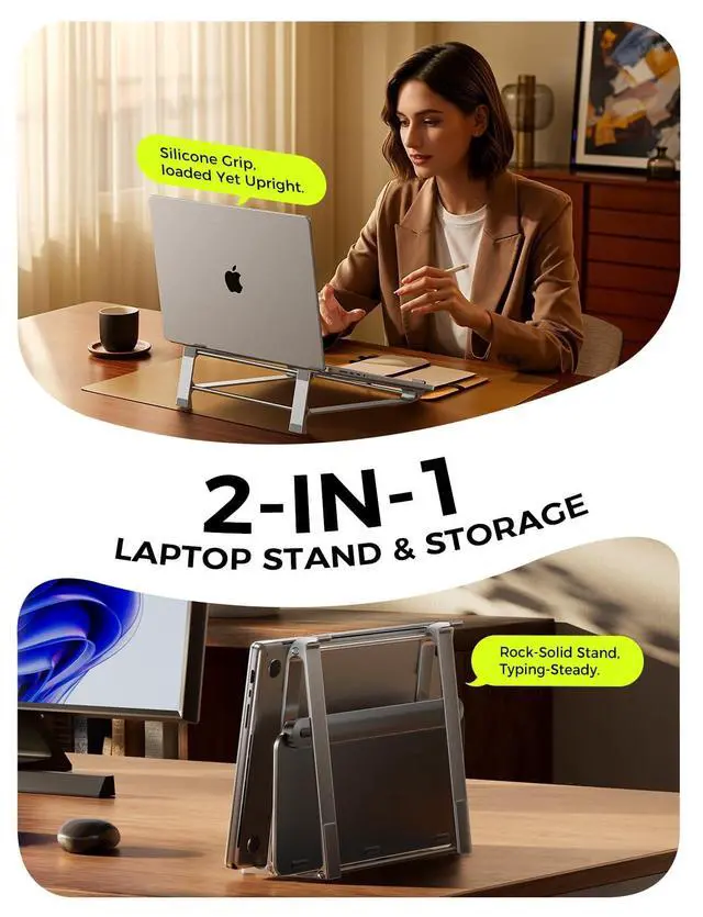 Storage & Display: This laptop stand features a unique dual-mode design: use it as laptop cooling stand for daily work, or switch to vertical laptop stand to save 60% desk space. Ideal compact solution for laptop storage stand needs! ^^