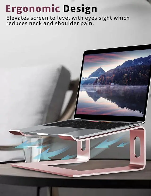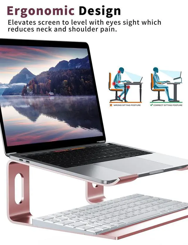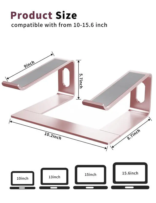 Broad Compatibility - Suitable with laptops of 10 to 15.6 inches, such as MacBook Pro 13/15, MacBook Air 13.3, Dell, XPS, Lenovo, HP, ASUS, Google Pixelbook, Samsung and other notebook computers of 10, 11, 12, 14, 15.4, 15.6 inches, etc. ^^ Ergonomic Design - Elevates your laptop height by 6 inches, a perfect height for your eye, neck and shoulder. ^^ Durable & Protective - Metal appearance made of thickened aluminum alloy, strongly durable. The rubbers on the top and bottom of holder ensure it sticks tightly to your laptop and desk, and protect your computer and desktop from scratches.
