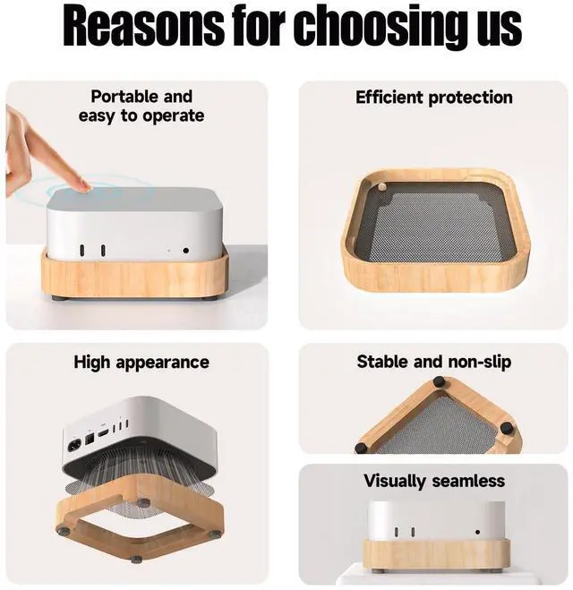 Keep your Mac Mini M4/M4 Pro running cooler and cleaner for enhanced performance and longevity. ^^ [Scratch-Resistant Protection] Features perfect fit and a smooth, hand-finished wooden surface to securely cradle your Mac Mini without scratches. Anti-slip padding with EPE foam which has highly durable with excellent shock-absorbing performance, ensures stability on desks, counter-tops, or mounted setups, protecting both device and furniture. ^^ [Intuitive Power Button Access] A thoughtfully placed cutout aligns perfectly with the 2024 Mac Mini M4s bottom-mounted power button, for mac mini m4 dock stand enabling effortless access without removing the device at all.